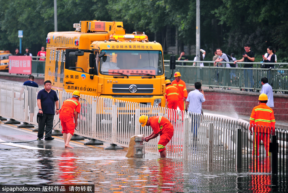 2018年7月16日上午,回龍觀地區育知東路輕軌橋下積水嚴重,已造成交通中斷,積水最深時達3米。北京排水集團搶險大隊的應急車輛正在對橋下積水進行應急抽排作業。