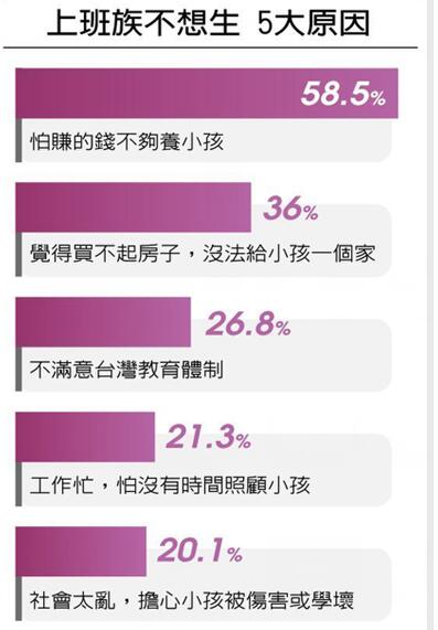 要知道臺(tái)灣是沒(méi)有“計(jì)劃生育”的,然而就在臺(tái)當(dāng)局一直出臺(tái)措施鼓勵(lì)生育時(shí),臺(tái)灣民眾依舊不愿意生孩子。根據(jù)2015年10月臺(tái)灣媒體披露的一組關(guān)于生育調(diào)查的數(shù)字顯示,高達(dá)87%的受訪者表示不會(huì)因生育補(bǔ)助而生小孩。