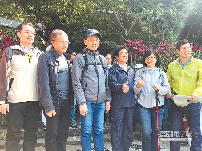 游錫堃(左三)偕同黨籍“立委”登觀音山硬漢嶺,高志鵬(左二)炮火四射。(圖片來源:臺灣《中時電子報》)