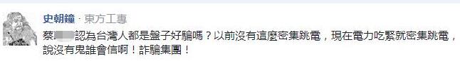 但網(wǎng)友還是不領(lǐng)情,“又在說干話”;有人直言,對于可能發(fā)生停/跳機原因,沒有預(yù)防性措施或任何作為,放任隱藏停/跳電危機,還好意思歸究設(shè)備老舊及天氣炎熱這類干話,信義區(qū)及臺北101是屬于臺北市較晚開發(fā)的地方,“你們相信因為設(shè)備老舊造成停電?大家都心知肚明別再騙了”;更有人說“現(xiàn)在臺灣每天都像在抽生死簽,看誰倒霉輪到誰限電……哦,臺電說這是跳電”。