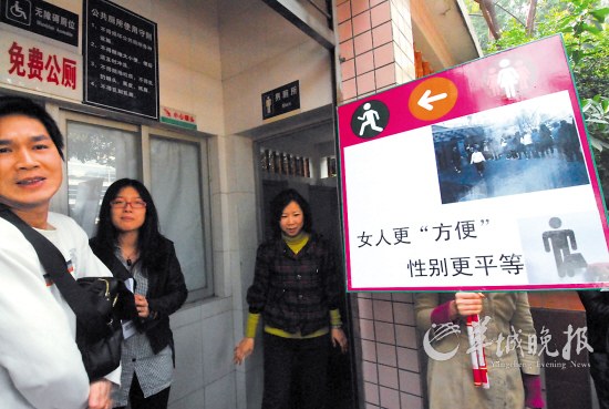 “先生,可以稍微等幾分鐘再進廁所,讓女士先用一下男廁所好嗎?女廁所那邊排的隊太長了……”2月19日上午,在廣州市越秀公園旁的一個免費公廁旁,幾名女大學生上演了一場“占領男廁”的行為藝術。她們希望通過這次活動,引起政府和社會對男女廁位不均衡問題的重視,從而消除女性在公共場所如廁排隊現象。(2月20日《廣州日報》)