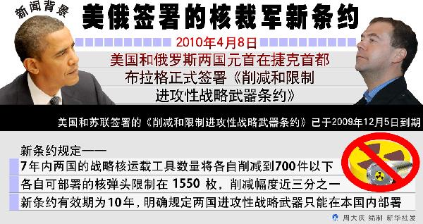 新的《削減和限制進攻性戰略武器條約》由美國總統奧巴馬和俄羅斯總統梅德韋杰夫去年4月在捷克首都布拉格簽署,以替代2009年失效的舊條約。