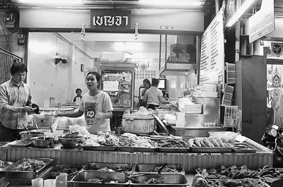 曼谷市區(qū)碧武里路7街并不寬敞的巷子里,布滿各式餐館。一家快餐店里顧客絡(luò)繹不絕,這里主營傳統(tǒng)泰餐:豬腳飯、炸魚段、炒青菜等,種類繁多,葷素均有。店主本佳告訴記者,一菜一飯需20—25泰銖(1泰銖約合0.2元人民幣),兩道菜再加5銖,只需25—30泰銖便可吃飽。本佳指著店門口懸掛的一個(gè)淺藍(lán)色牌子說,“我們就是Thong Fah”。Thong Fah在泰語里意為“藍(lán)旗”,即泰國政府推出的“藍(lán)旗”計(jì)劃,本佳的小店為顧客提供“藍(lán)旗餐”。