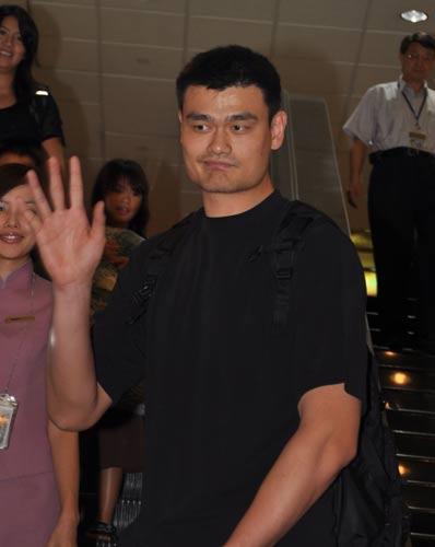 來臺參加“2010姚基金慈善之旅”活動的美國職籃休斯敦火箭隊中鋒姚明(前),26日下午搭機抵達桃園機場,揮手時還故意扮怪臉。