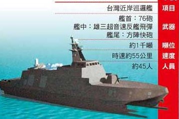 臺當局“國防部”目前在臺軍軍史館舉辦“海上長城—海軍司令部特展”,展示圖中有一張“近岸巡邏艦”的計算機原型圖,讓海軍秘密研發的船艦曝光。海軍備役軍官臧持新表示,近岸巡邏艦船體設計采最先進的雙船體構造,具有匿蹤與高耐波性優點,高耐波性可使速度變快,比一般傳統型船艦時速快七至八公里;若再配上自制的雄三超音速反艦飛彈,對航母及其它巡洋艦均是嚴重威脅。