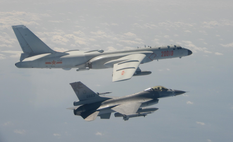 臺軍公布臺灣空軍F-16戰機掛彈攔截監視我轟-6K的照片。