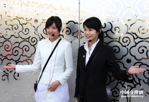 “歡迎來到臺灣館!”甜美和善的笑臉,悅耳親切的語調(diào),儀態(tài)萬方的身姿,舉手投足無不展現(xiàn)“臺式”待客之道。游客來到臺灣館,這第一景就是享受“領航員”的優(yōu)美外形和優(yōu)質(zhì)服務。