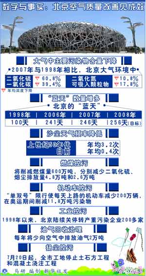 北京的“藍天”,從1998年的100天增加到2006年的241天,翻了一番多;2007年的“藍天”數(shù)為246天,比2001年申奧成功當(dāng)年提高了15·6%。今年,北京“藍天”數(shù)量的目標(biāo)256天,占全年的70%。