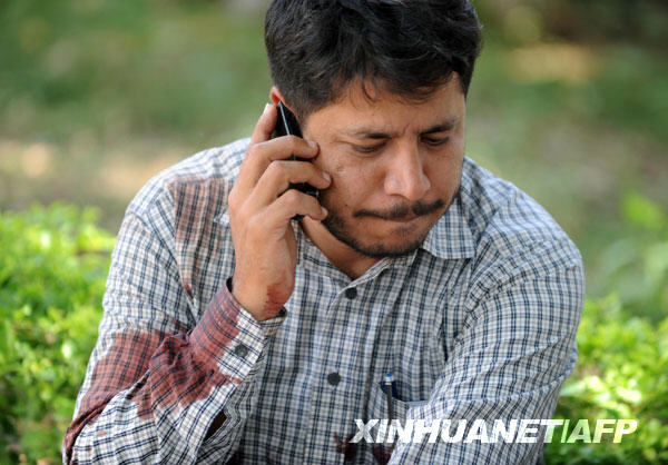 10月5日,在巴基斯坦首都伊斯蘭堡,一名身上有血跡的聯合國雇員在發生爆炸的辦公室外打電話。巴基斯坦警方稱,聯合國駐巴機構位于巴首都伊斯蘭堡的辦公室附近當天發生爆炸,造成至少3人死亡,爆炸原因目前尚不清楚。新華社/法新