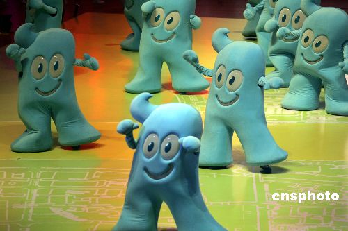 十二月十八日晚,中國二0一0年上海世博會吉祥物在上海揭開神秘面紗。一個返璞歸真的、漢字“人”的藍色卡通造型——吉祥物“海寶”正式亮相。 中新社發 潘索菲 攝