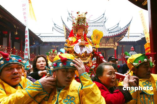 1月24日,由福州馬尾區政府投資近千萬元重建的世界唯一一座船政天后宮竣工。當日上午,兩岸宗教界有關人士和媽祖信徒舉行船政天后宮竣工和恭迎媽祖金身安座儀式。據了解,船政天后宮將于春節期間,即可向公眾開放。背景資料:這座始建于1868年春季、耗資3082兩白銀的船政天后宮,在歷次戰亂中屢遭不測,最終在1971年被拆毀。為弘揚船政文化,福州市馬尾區政府決定重建船政天后。2005年10月開工,在原址上按原比例擴大1/3規模重建,總用地面積7205平方米,建筑總面積1500平方米,門樓高12米、面闊27.22米,主殿5開間,進深8.3米?傮w布局為一軸二進二院。一進為門樓,恢復原貌;下中庭為戲臺,上中庭為拜閣;二進為供奉媽祖及配神的大殿。后院為魁星閣等。按天后宮的原有格局、組織結構形成歷史脈絡,共分三個功能區:祭媽祖廟宇區、接待陳列與附屬設施區和休閑區。 中新社發 汪虎 攝