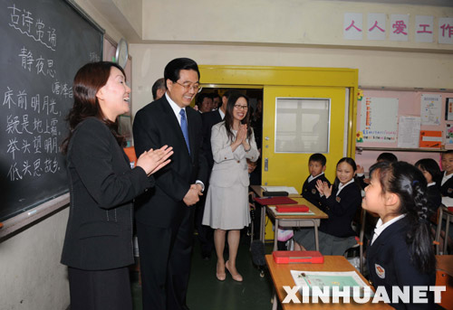 新華網日本橫濱5月9日電 通訊:傳播中華文化 促進中日友好——記胡錦濤主席參觀橫濱山手中華學校