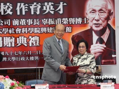 六月二日,辜振甫的遺孀辜嚴倬云替他完成遺愿,捐贈臺灣大學社會科學院興建圖書館。圖為臺灣大學校長李嗣涔向辜嚴倬云致贈感謝狀。 中新社發 耿軍 攝