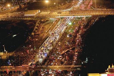 昨晚9時左右,從安慧橋一路向西,直到健翔橋,四環兩側全部站滿了觀看焰火的市民。為了保證安全,鳥巢周邊的過街天橋全部封閉,在一些橋面上,能看到成批的警察。