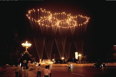 10點,天安門廣場南側、人民英雄紀念碑前,紅的、綠的、金黃的,一排柱形的禮花形成簾幕,照亮了遠處的城樓。正陽門南,瞬時“咚、咚”炮聲大作,怒放的紅牡丹、含蓄的金菊花、藍紫的水仙、綠的繡球……各種造型的煙火同時綻放,與北邊的簾幕斗艷。