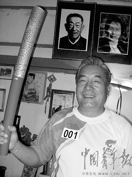劉長春之子、北京奧運火炬手劉鴻圖在父親遺像前微笑擎起火炬。本報記者 張國攝