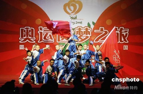 8月13日,來自全國31個省市自治區和港、澳、臺、僑的128名青少年代表,參加由共青團中央、北京奧運會志愿者工作協調小組共同舉辦的“奧運圓夢之旅”開營儀式。圖為開營儀式上的武術表演。 中新社發 王東明 攝