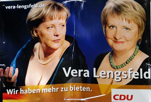 默克爾(左)和倫斯費(fèi)爾德身穿低胸晚裝,露出乳溝的競選海報(bào),吸引了許多選民的眼球。