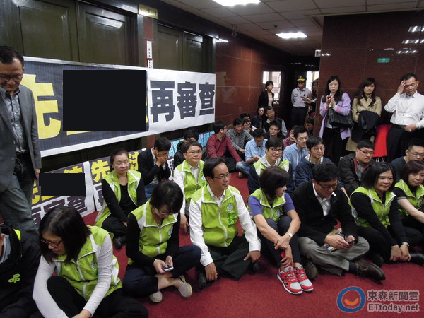 中國臺灣網4月2日消息 據臺灣媒體報道,臺“內政委員會召委”、國民黨“立委”張慶忠2日排審服貿,民進黨“立委”前一夜就夜宿會議室,2日早上7點30分在會議室外靜坐,并用“先‘立法’、再審查”的海報封住會議室大門,阻止國民黨進入開會,而“立法院”的議事人員也被擋在門外。