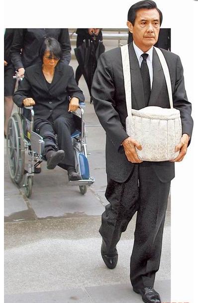 馬英九捧著母親骨灰壇準備安置到靈骨塔,腿傷的周美青坐輪椅緊隨其后。(圖片來自臺媒)