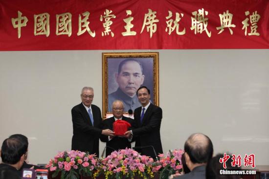 國民黨19日舉行新任黨主席就職典禮,馬英九、吳敦義、國民黨榮譽主席吳伯雄都出席。馬英九表示,國民黨是有是非、講道義的政黨,希望全體黨員在朱的領導下眾志成城、繼續奮力打拼;吳敦義則提出20字祝福。