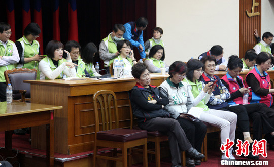 資料圖:2014年3月17日,臺灣立法機構8個常設委員會聯席初審海峽兩岸服務貿易協議,從中午起,朝野“立委”在立法機構大禮堂發生數波沖突。圖為朝野“立委”搶占主席臺。中新社發 陳立宇 攝