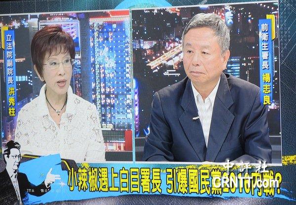 “立法副院長”洪秀柱與前“衛(wèi)生署長”楊志良27日一起接受媒體人趙少康《少康戰(zhàn)情室》節(jié)目專訪,在一個小時的節(jié)目里完全沒有戰(zhàn)火,只有互相吹捧,洪秀柱在節(jié)目里還拿了三本楊志良的書說認(rèn)同楊的理念,如果當(dāng)選“總統(tǒng)”就會為請楊擔(dān)任“行政院長”。
