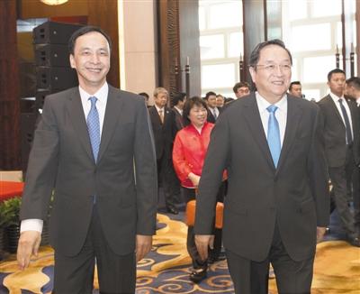 昨日,上海浦東,俞正聲與朱立倫共同步入第十屆兩岸經貿文化論壇會場。新華社記者 王曄 攝