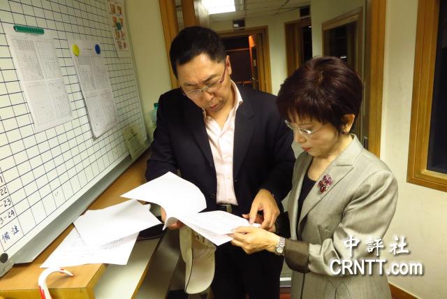 洪秀柱拿出兩份講稿,請?zhí)葡纨?左)等資深名嘴,給予更專業(yè)的意見。(中評社 彭媁琳攝)