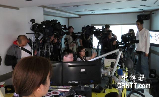 POP Radio電臺現場擠滿采訪王如玄的記者。(中評社 張嘉文攝)