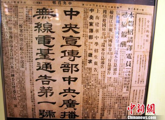 圖為臺(tái)灣“中央廣播電臺(tái)”文史館展出的該臺(tái)創(chuàng)臺(tái)和開播前一日,當(dāng)時(shí)的“中央日?qǐng)?bào)”刊登的預(yù)告消息。