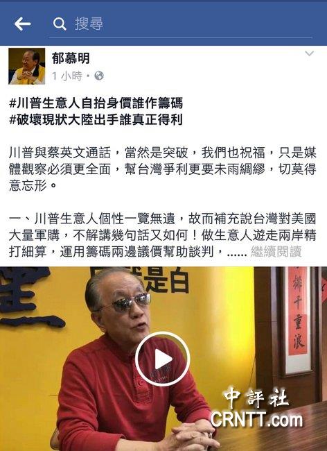 新黨主席郁慕明在“臉書”上發(fā)表對蔡英文與特朗普通話的看法(圖片來源:中評社)