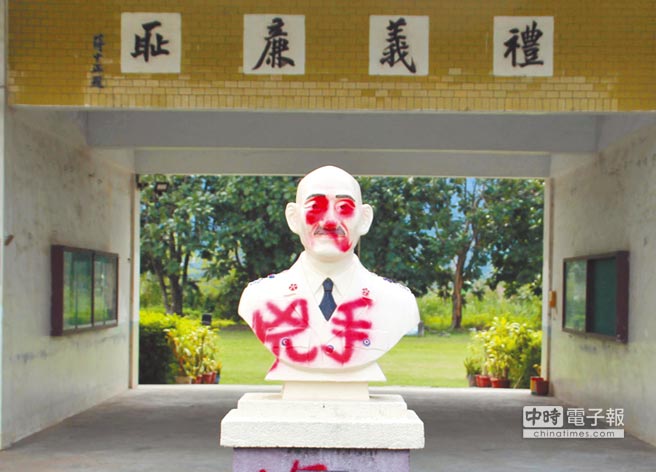 2017年3月1日,花蓮壽豐鄉(xiāng)吳全社區(qū)活動(dòng)中心將蔣公銅像雙眼、嘴角皆噴上紅漆。(圖片來源:臺(tái)灣《中時(shí)電子報(bào)》)