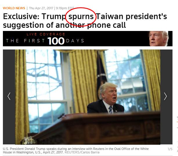 路透社4月27日發(fā)布題為“特朗普‘一腳踢開(kāi)’蔡英文的再次通話的建議”獨(dú)家報(bào)道