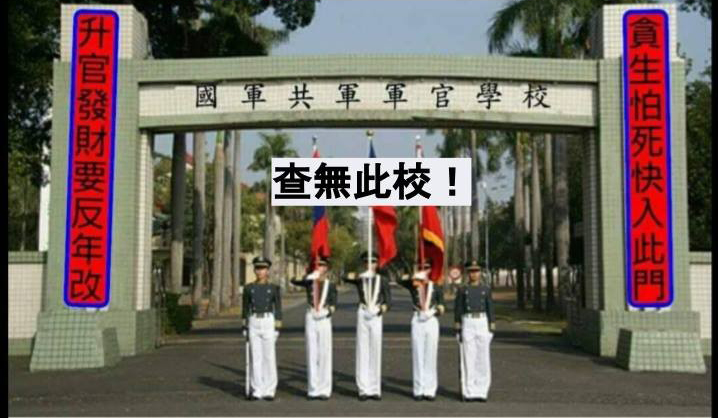 這張被PS的照片中,臺(tái)陸軍官校校訓(xùn)“貪生怕死莫入此門,升官發(fā)財(cái)請(qǐng)走他路”,被諷刺為“貪生怕死快入此門,升官發(fā)財(cái)要反年改”,并P于學(xué)校大門兩側(cè)。