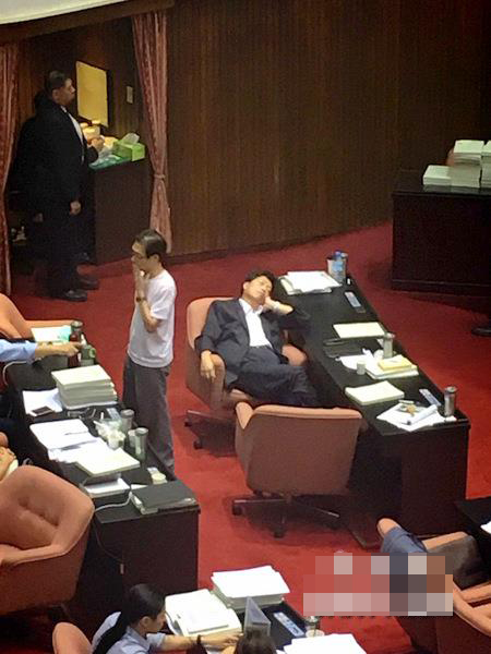 “院會”從昨挑燈夜戰逐案表決直到今天凌晨5時,值夜的藍綠“委員”直接在椅子上補覺。(中評社圖)