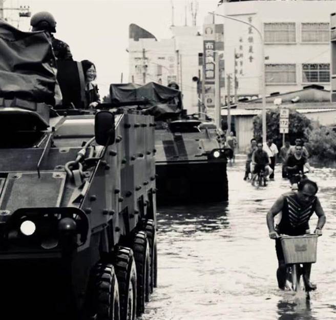 蔡英文勘災時在云豹車上笑著揮手。(圖片來源:臺灣《中時電子報》)