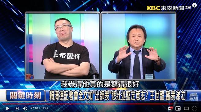 王世堅在節(jié)目中表示,賴清德的記者會讓他相當(dāng)感動,有如《出師表》般優(yōu)秀,“出師表”三字一出,全場笑聲不斷,主持人更問“你有臨表涕泣嗎?”王世堅秒回“對,我臨表涕泣,我覺得他真的是寫得很好”,此時嘉賓朱學(xué)恒在一旁翻白眼吐舌忍笑,但最終還是忍不住笑了出來。