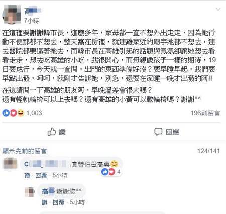 然而,近日來(lái),韓國(guó)瑜在高雄引起的話題與氣氛卻讓她媽媽想去看看走走,想去吃高雄的小吃,“母親像孩子一樣的期待,19日要成行,今天就一直問(wèn),出門(mén)的東西準(zhǔn)備好沒(méi)?要早睡早起,我們要早點(diǎn)出發(fā)”。該網(wǎng)友也向高雄網(wǎng)友問(wèn)及,早晚溫差會(huì)不會(huì)很大、輕軌輪椅可否上去、高雄的小黃能不能載輪椅等問(wèn)題。