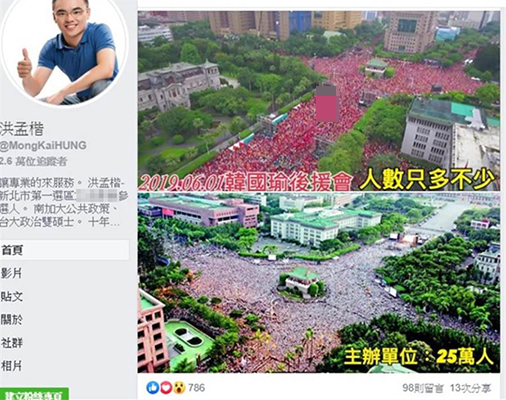 洪孟楷在臉譜網(facebook)指出:對比5年多前“白衫軍”號稱25萬人上街頭,隔天報紙報道有20萬人,一樣的面積場景,1日韓國瑜的造勢對比只多不少,要不就是當年白衫軍灌水灌很大、不然就是現在綠營在半夜吹口哨壯膽。