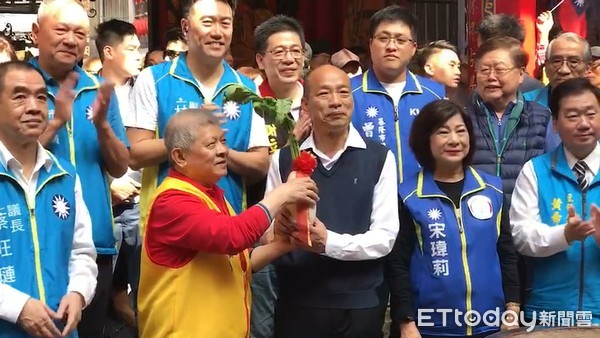 韓國瑜出征基隆與“立委”候選人宋瑋莉一同拜開漳圣王,并收下白菜頭盼當選。(圖片來自:臺灣“東森新聞云”)