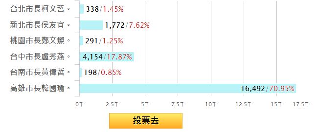截至28日早上8點47分許,共計有23245票,民進黨籍桃園市長鄭文燦只獲得291票,僅占1.25%;民進黨籍臺南市長黃偉哲獲得198票,占總票數0.85%;無黨籍臺北市長柯文哲拿到338票,占總票數1.45%。國民黨籍臺中市長盧秀燕獲得4154票,占總票數17.87%;國民黨籍高雄市長韓國瑜拿下16492票,高達總票數70.95%,新北市張侯友宜拿下1772票,占總票數7.62%。(中國臺灣網 李寧)