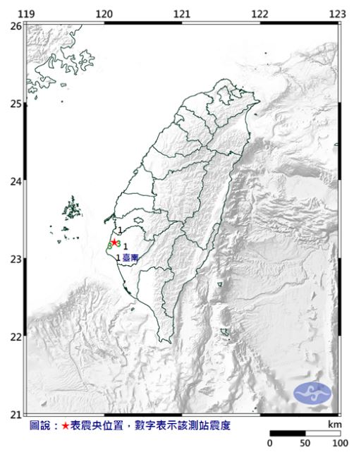 臺灣臺南市發生3.2級地震 最大震度3級