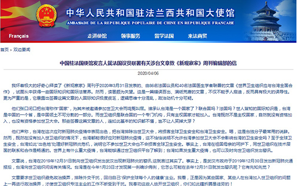 4月6日,中國駐法國使館官網(wǎng)刊文《中國駐法國使館發(fā)言人就法國議員聯(lián)署有關(guān)涉臺文章致<新觀察家>周刊編輯部的信》。(圖片來源:中國駐法大使館官網(wǎng))
