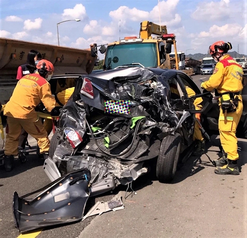中國臺灣網5月2日訊  據臺灣《聯合報》報道,屏東縣里港鄉屏10線青龍寺附近今天(2日)上午近9時發生連環車禍案,現場為4輛砂石車及2輛轎車追撞,有2名乘客受困。屏東縣消防局派遣3輛破壞器材車、6輛救護車共9車17人前往救援,抵達現場后于9時19分分別將人員救出及送醫,現場有8名傷者(5男3女),無生命危險。