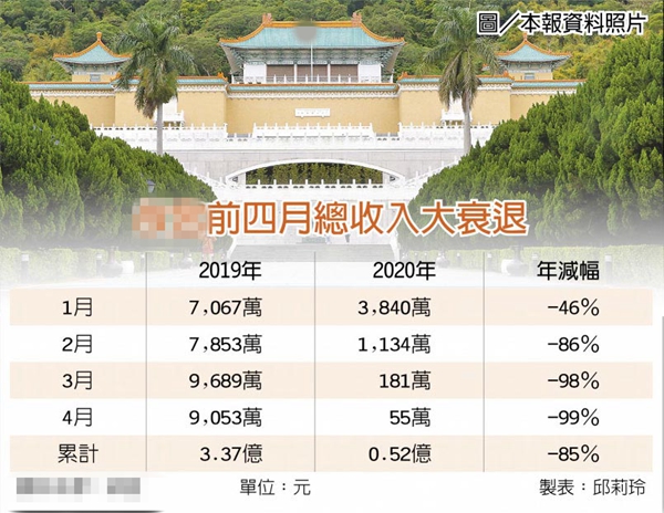 據報道,臺北故宮去年門票收入為8.52億元,原本預估今年收入9億元,但前4個月僅收入5211萬元、達成率僅6%。以境外游客較多的臺北故宮北院為例,去年1到4月平均有37萬名游客,今年2月僅剩6.2萬,4月更慘跌至1萬。此外,臺北故宮去年底推出的“愛臺灣博物館卡”,原本預期要賣5萬張,但迄今只賣出3760張。臺北故宮院長吳密察表示,這是開館以來的最慘紀錄,期望下半年好轉,但境外仍然狀況不明,還是不敢樂觀。
