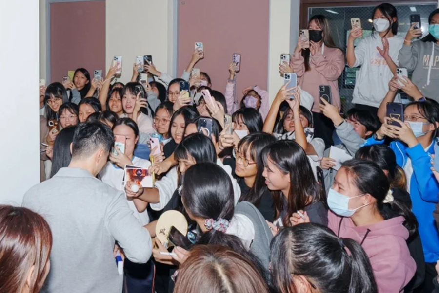 據報道,不少粉絲早早就來到校門外守候,希望一睹馬龍風采,馬龍也和現場媒體及粉絲揮手打招呼。雖然沒有舉辦大規模的交流活動,但馬龍仍在校園里刮起旋風。慕名而來的女學生祭出“手機!,甜喊“龍哥”,圍著他搶拍、合影,現場猶如粉絲見面會般熱鬧。