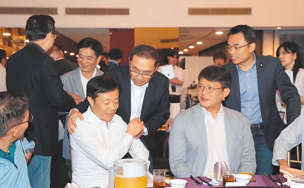 新北市長(zhǎng)侯友宜(中)日前邀請(qǐng)新北市區(qū)域與不分區(qū)民代餐敘,拜托協(xié)助新北爭(zhēng)取各項(xiàng)重大建設(shè),民進(jìn)黨民代張宏陸(左三)、民眾黨民代黃國(guó)昌(右二)、國(guó)民黨民代洪孟楷(右)與新北市副市長(zhǎng)劉和然(左)都出席。(圖片來(lái)源:臺(tái)灣“中時(shí)新聞網(wǎng)”)