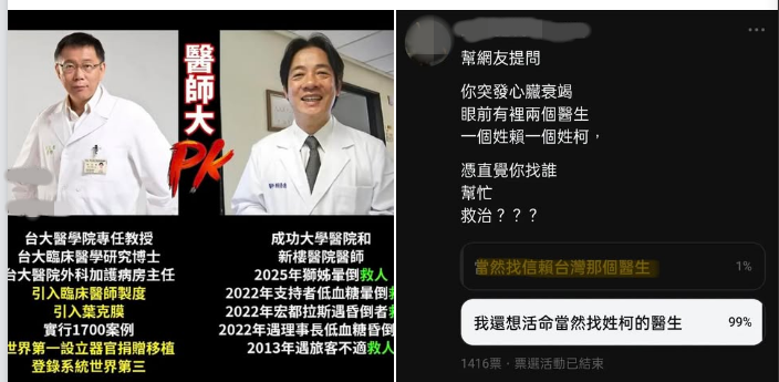 還有島內網友發起了網絡投票:“幫網友提問,你突發心臟衰竭,眼前有兩個醫生,一個姓柯、一個姓賴,憑直覺,你會找誰幫忙救治?”結果共投出1416票,僅有1%的網友選擇“當然找信賴臺灣那個醫生”,而99%的網友則投給“我還想活命,當然找姓柯的醫生!”