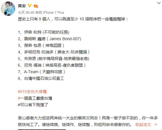 “815全臺停電”事件也引發(fā)了不少臺灣演藝界人士的關(guān)注。